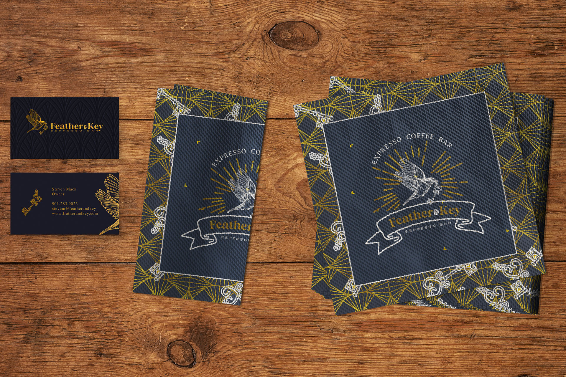 Feather & Key Express Bar embodies the essence of the roaring twenties, exuding an air of opulence and sophistication reminiscent of the Great Gatsby era. Our brand identity design seamlessly marries the lavish extravagance of the Jazz Age with the clandestine allure of a speakeasy, creating a unique ambiance that transports patrons to a bygone era of glamour and intrigue. The logo of Feather & Key features a stylized flying bird carrying a golden key in its beak, symbolizing freedom and access to hidden treasures. Rendered in rich gold tones, the logo is accompanied by elegant typography that evokes the grace and refinement of the Art Deco period.